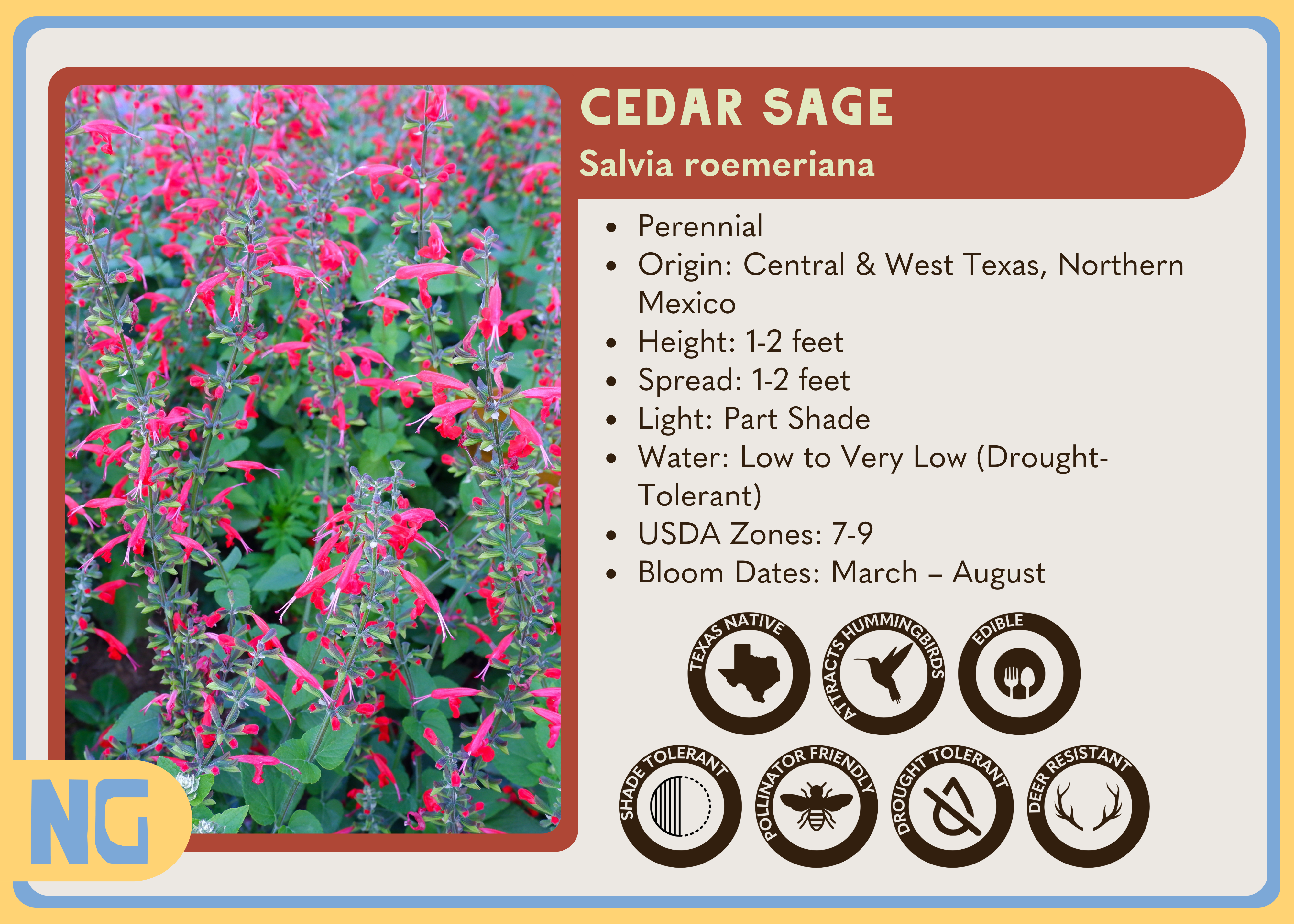 Cedar Sage (Salvia roemeriana) is a striking, red-flowered perennial herb native to central and west Texas, extending into northern Mexico. Adapted to thrive in the shade and fine leaf mulch of Ashe Junipers (Juniperus ashei), this drought-tolerant salvia is ideal for dry, rocky, limestone-based soils. Its rounded, scalloped leaves form a low-growing rosette, while vivid crimson blooms rise on 2-3 inch racemes from early spring through summer, attracting hummingbirds and butterflies. Cedar Sage excels in woodland gardens, shaded rock gardens, and containers, bringing ornamental appeal and wildlife benefits. Though highly deer-resistant, it requires well-drained soil and careful leaf management for successful naturalization.