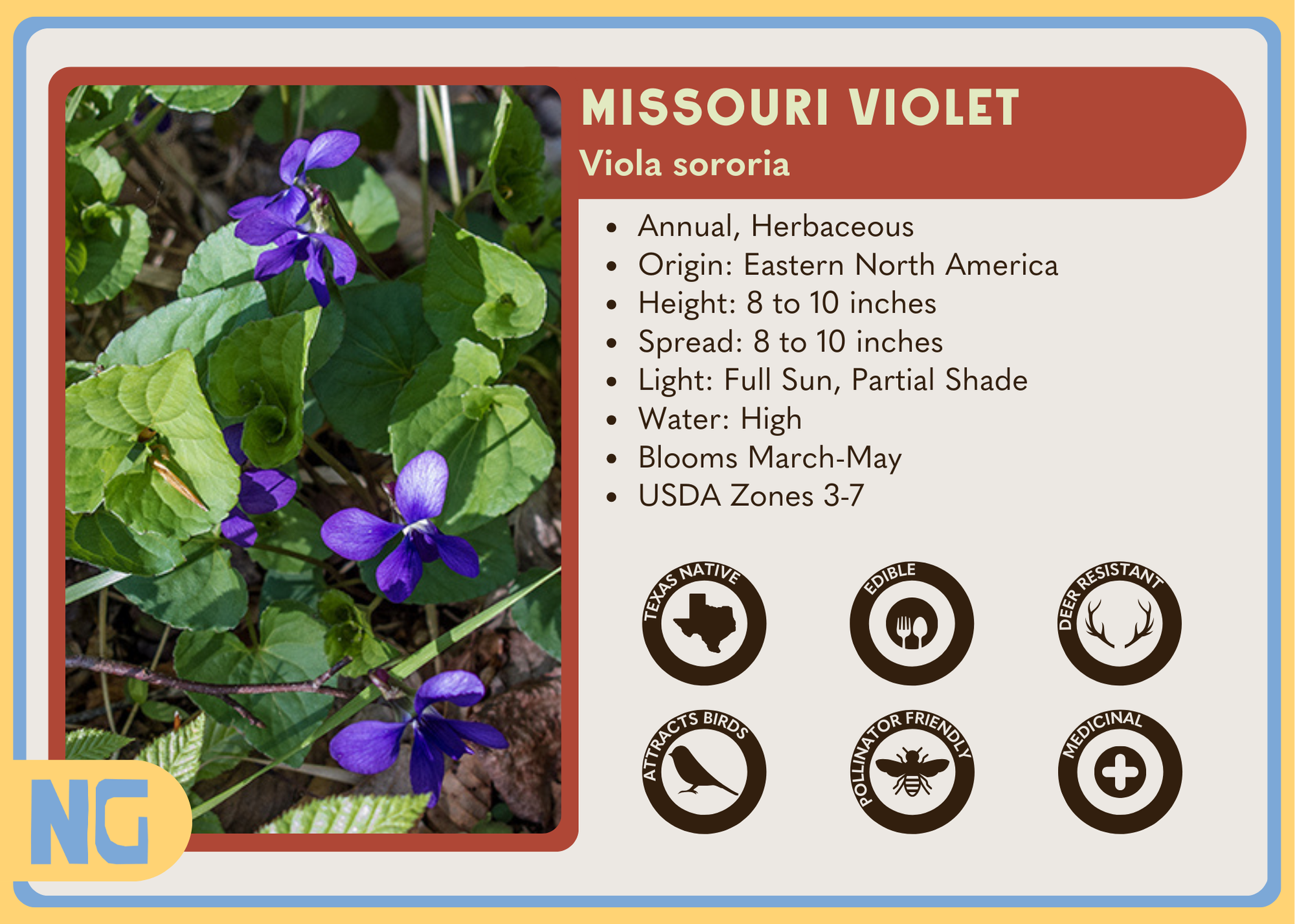 Missouri Violet (Viola sororia) is a versatile herbaceous plant that thrives in moist, rich soils and adapts well to both full sun and partial shade. Preferring high water use, it flourishes in consistently moist environments. Missouri Violet is known for its glossy, heart-shaped leaves and striking purple flowers with white throats, which bloom in spring. It attracts birds, offers high deer resistance, and can be used as a food source—its leaves are rich in vitamins A and C, and its flowers can be made into candies and jellies.