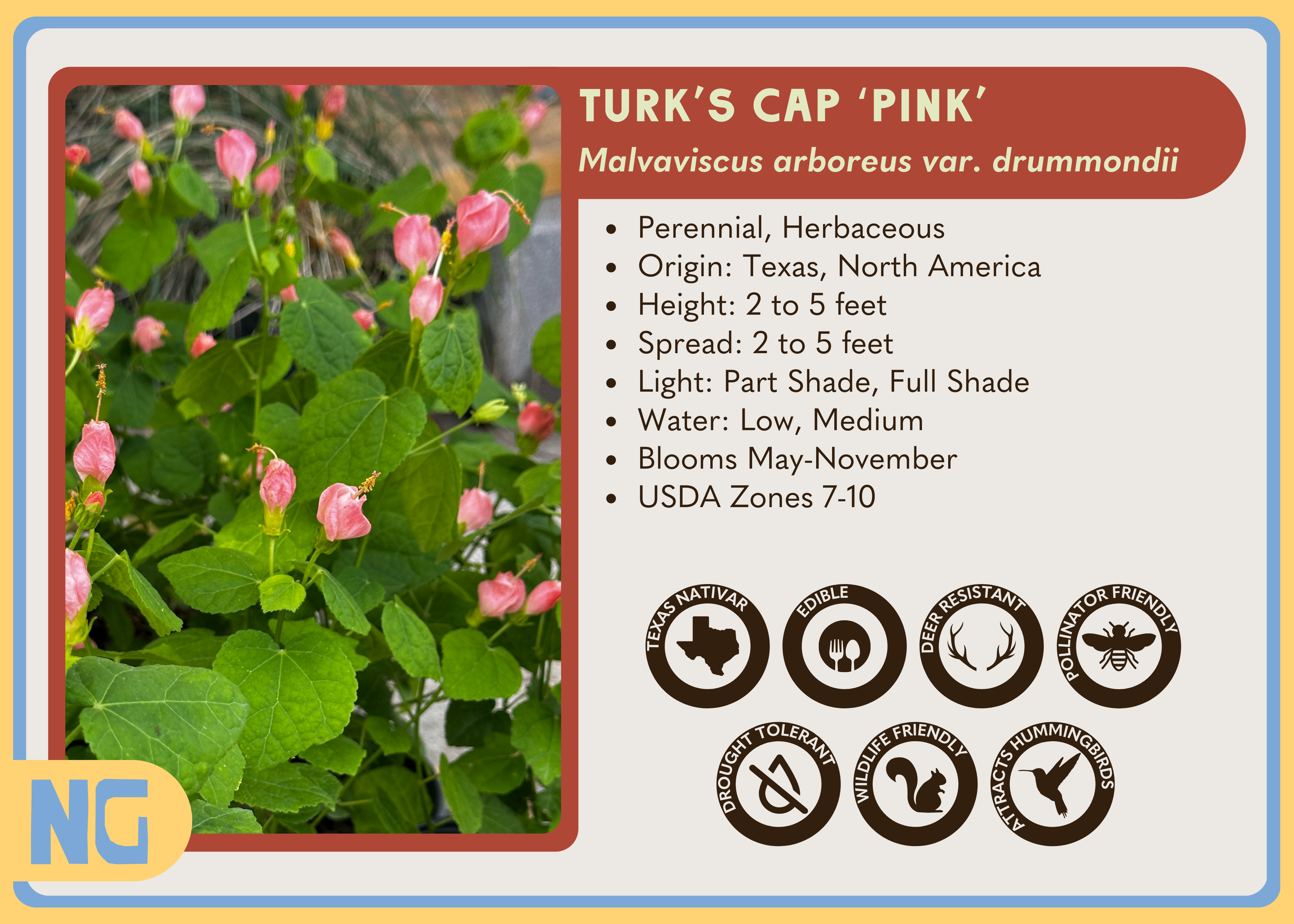 Turk's Cap 'Pink' (Malvaviscus arboreus var. drummondii) is a resilient and adaptable shrub, celebrated for its striking red flowers that remain partially closed, creating a unique turban-like appearance. Ideal for shady areas, Turk's Cap is drought-tolerant and thrives in a variety of soils, from sandy to clay, making it a low-maintenance choice for gardeners. Its showy blooms provide an excellent nectar source, attracting hummingbirds, butterflies, and other pollinators, while its berries are enjoyed by birds and small mammals. Additionally, the plant is known for its edible fruit, which has a flavor similar to apples, adding an extra layer of utility to its ornamental appeal.